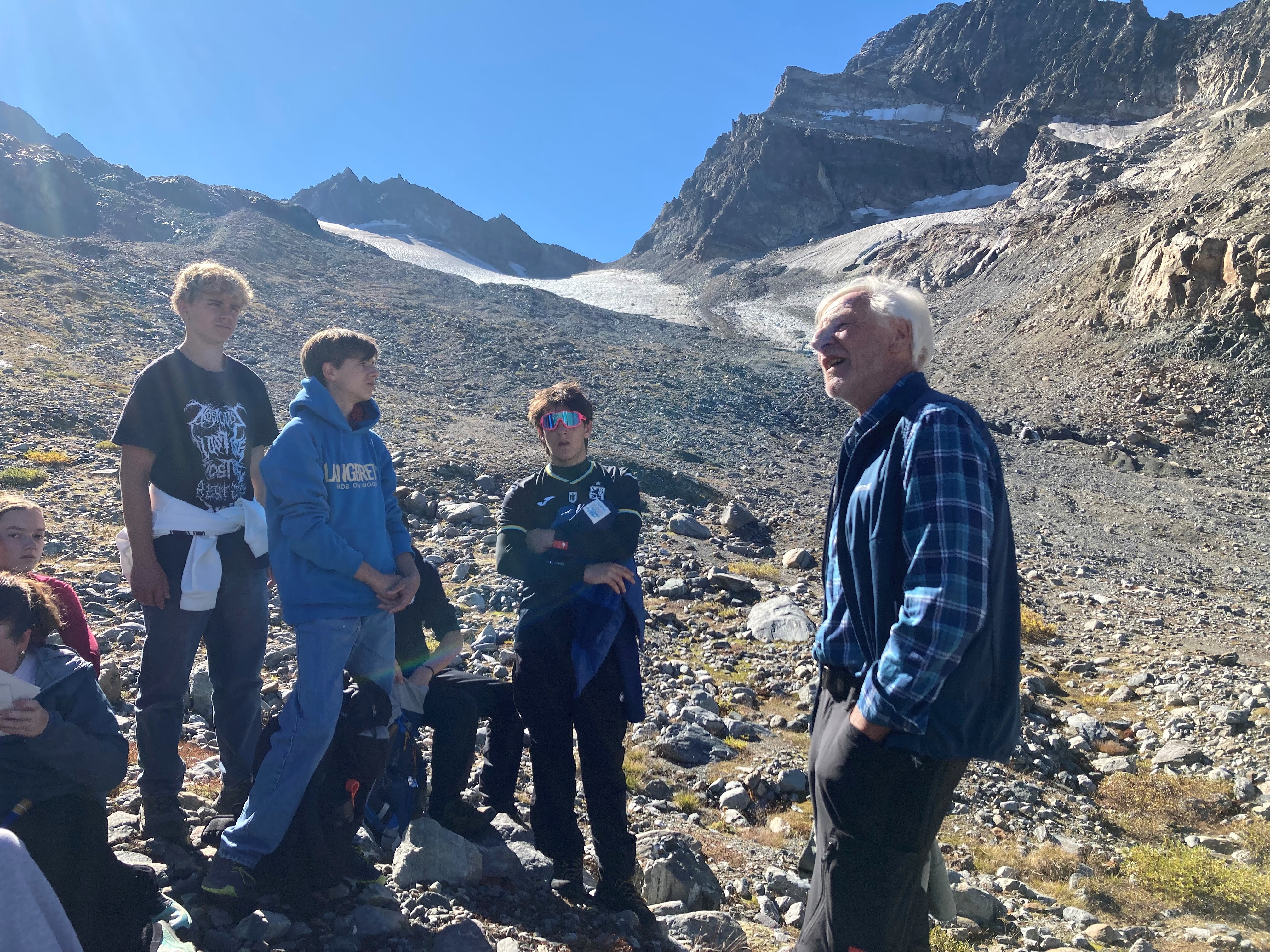 Am nächsten Tag stand zuerst eine Skizzierung der Berge und des Gletschers mit Karin Oberauer von der Universität Innsbruck am Programm und anschließend besichtigten die 6. Klassen den (toten) Vermuntgletscher. Mit dabei war der 75-jährige Gletscherexperte Günther Gross, der den Gletscher schon seit über 50 Jahren vermisst. Dieser erzählte uns von seiner Arbeit und der Geschichte des Gletschergebietes. Ein wenig später wanderten die Schülerinnen und Schüler zu einem Punkt, von dem man die drei großen Endmoränen sehen konnte.