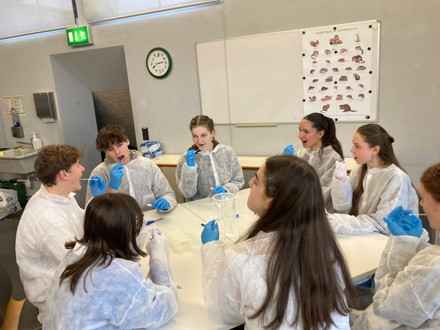 In der Woche vor den Semesterferien beschäftigten sich einige SchülerInnen der 7a und 7b im Wahlpflichtfach Biologie mit molekularbiologischen Untersuchungstechniken. Sie besuchten das Speziallabor der Inatura in Dornbirn, um am DNA -Profiworkshop teilzunehmen. In diesem Intensivkurs wurde die eigene DNA auf ein bestimmtes Gen hin untersucht. Die genetische Analyse der eigenen Mundschleimhautzellen soll zeigen, ob die TeilnehmerInnen zu den »Superschmeckern«, »Normalschmeckern« oder »Nichtschmeckern« hinsichtlich eines bestimmten Bitterstoffs gehören. Schon nach kurzer Zeit erwiesen sie die SchülerInnen als Profis im Umgang mit den Mikropipetten , dem PCR- Gerät, sowie dem Gelektropherese- Gerät. Die Begeisterung herauszufinden, ob man zu den Supertastern gehört - also zu jenen Menschen, die besonders empfindlich auf einen bestimmten Bitterstoff reagieren - war groß.