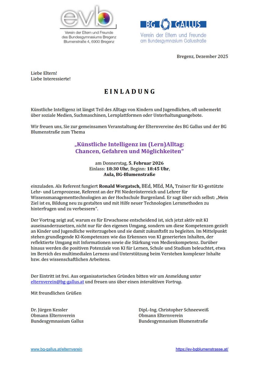 Einladung des Vereins der Eltern und Freunde am BG Gallus gemeinsam mit dem Elternverein des BG Blumenstraße zu einem sehr interessanten Vortrag am 5.2.2026: „Künstliche Intelligenz im (Lern)Alltag: