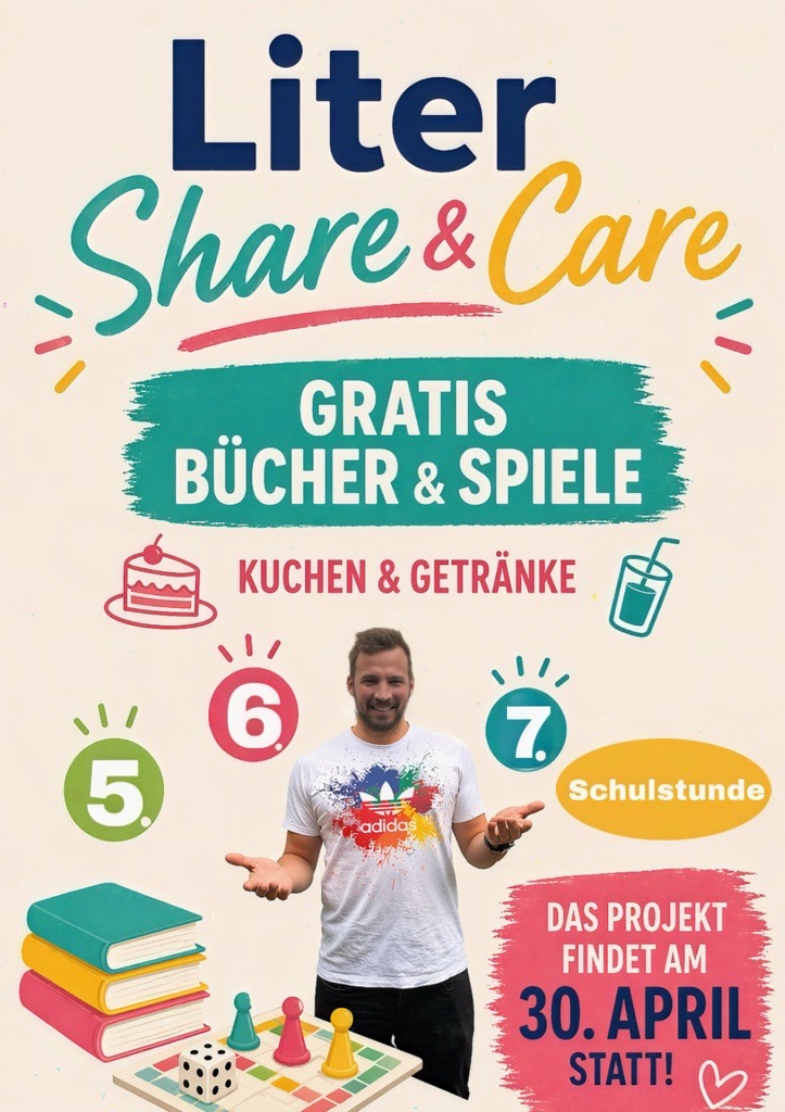 Kommt vorbei zum Event Liter share&care am 30. April und stöbert durch spannende Bücher und Spiele in entspannter Atmosphäre. Freut euch außerdem auf leckeren Kuchen, erfrischende Getränke und eine tolle Zeit. Bei schönem Wetter auf dem Sportplatz, ansonsten in der Aula.