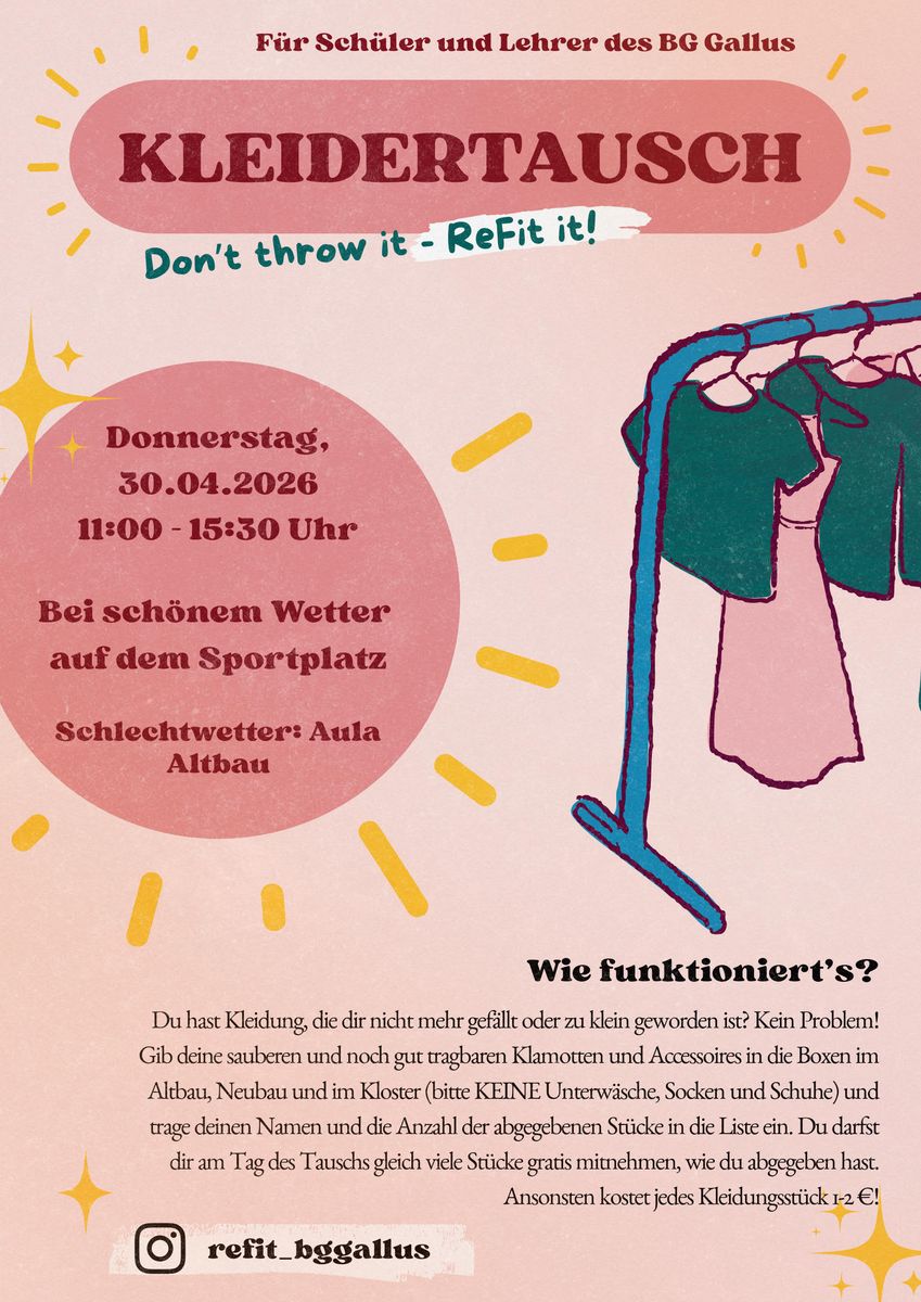 Eine Gruppe des k.i.d.Z.21 Projektes veranstaltet am 30.4. einen Kleidertausch beim Sportplatz. Wir bitten euch - Schüler, Eltern und Lehrer - eure Kleiderschränke durchzusehen und fleißig zu spenden! Im Neubau und im Altbau sind jeweils grün-pinke Boxen aufgestellt, bitte dort die Kleidung hineingeben und euren Namen auf die Liste schreiben. Vielen Dank.