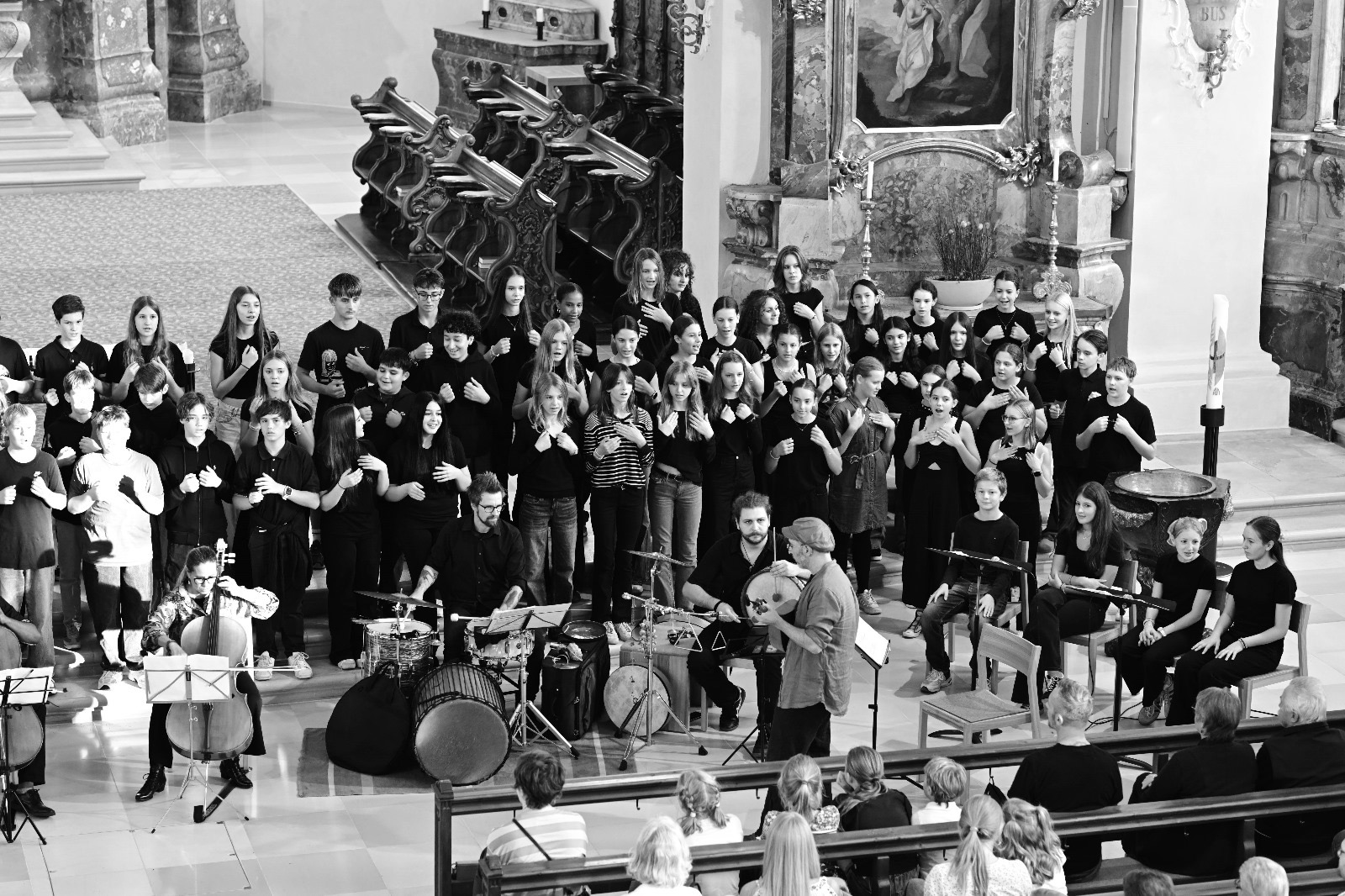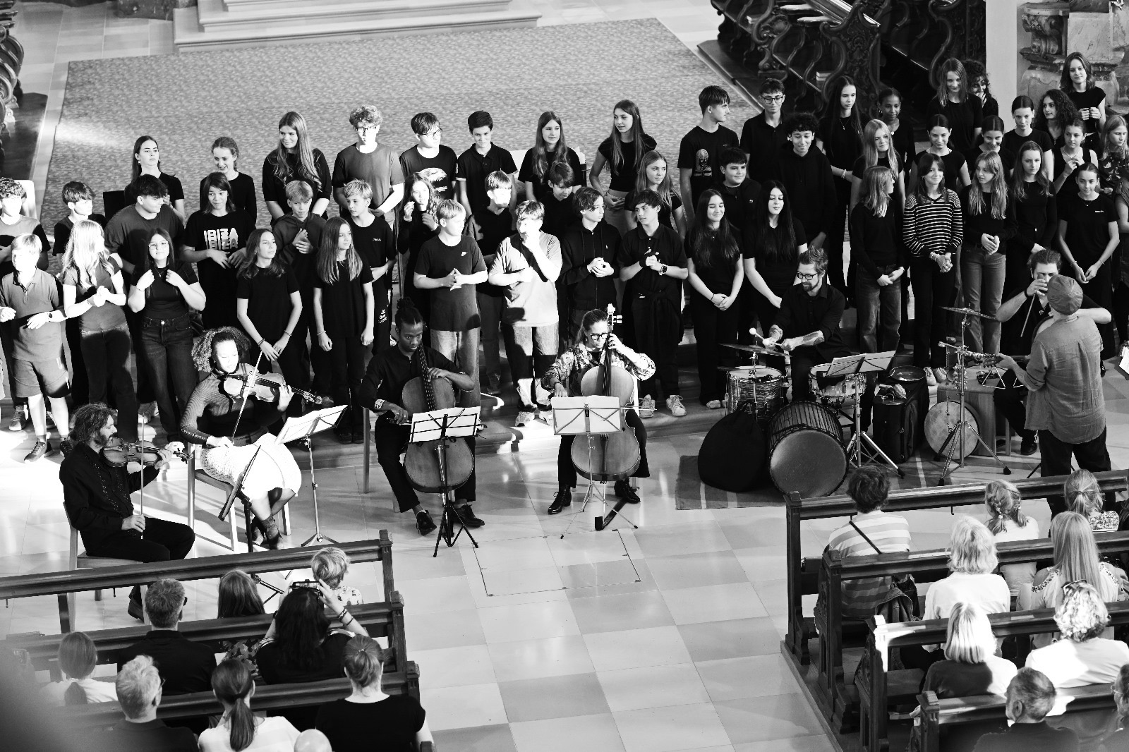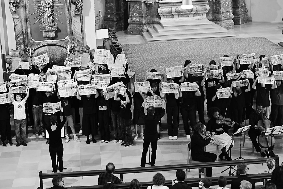 Somnia pacis - 120 SchülerInnen der 4. Klassen führen vor großem Publikum ein Musikprojekt von Andreas Paragioudakis in der Pfarrkirche St. Gallus auf